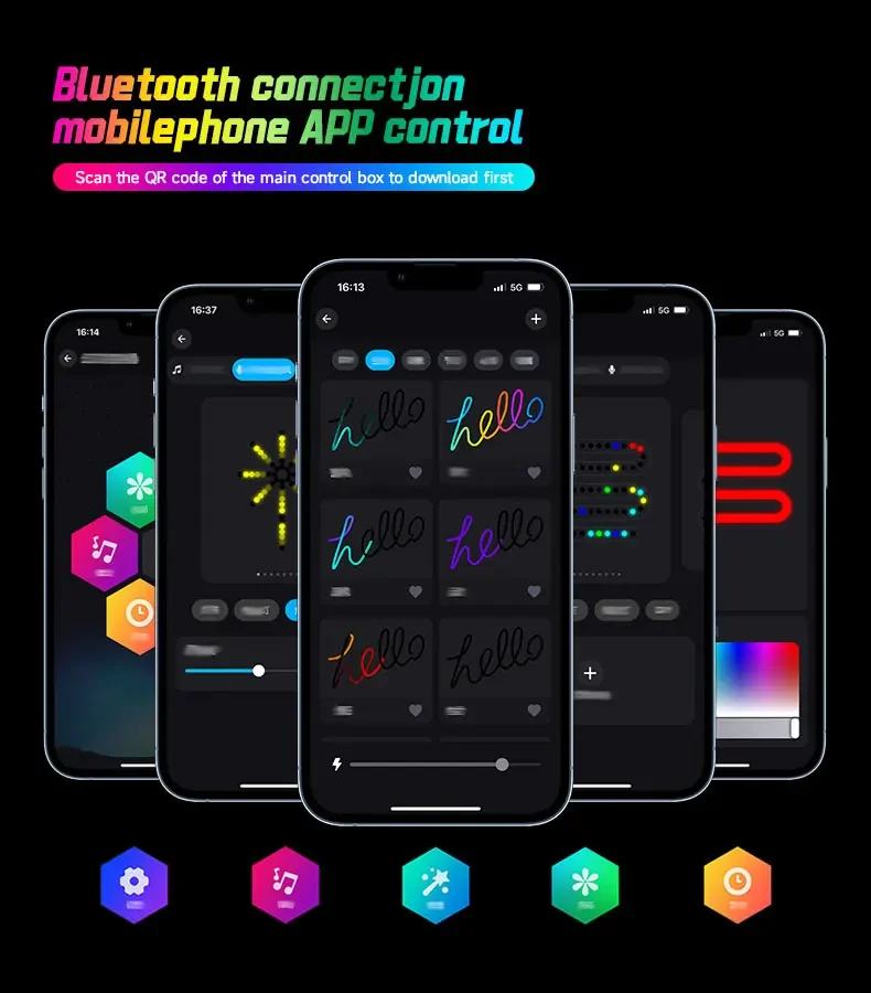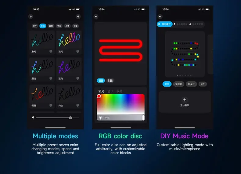 4. Active sound effects The lights jump and change with the rhythm of the music. Use mobile phone microphones can also produce lighting effects with different rhythms.