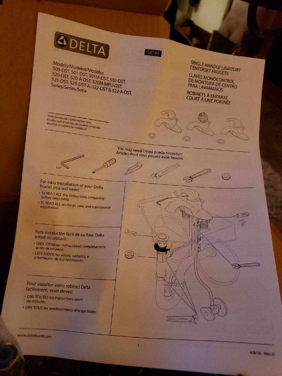 This particular model, the 500-DST, is a single-handle lavatory faucet designed for bathroom sinks. It features a lift rod hole for operating the drain. Delta faucets are widely used in residential and commercial settings due to their reliability and ease of installation.