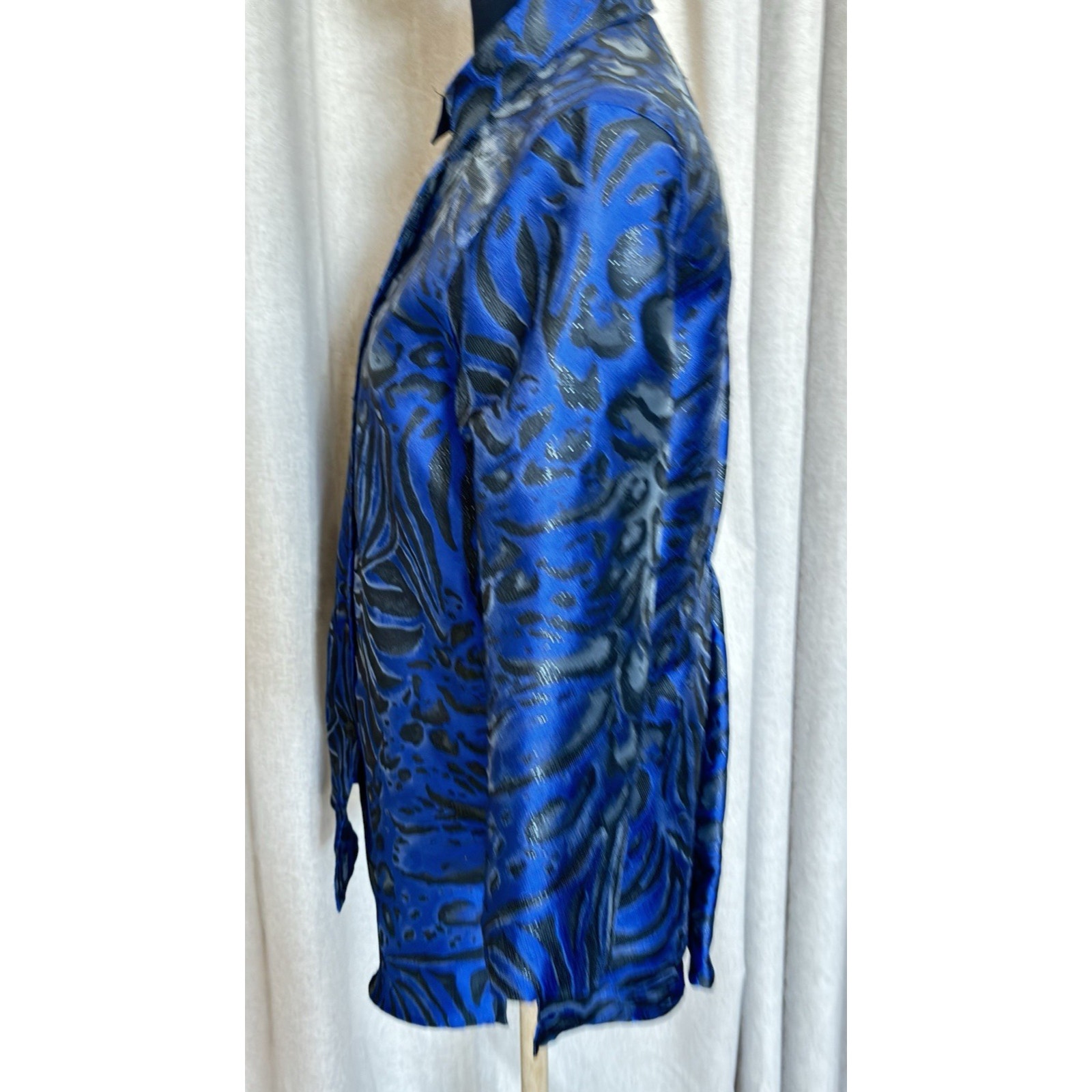 Metallic blue-black jacket that reflects Caroline Rose’s signature: MADE IN USA a colorful, textured piece with structure and polish—perfect for both day and evening wear.