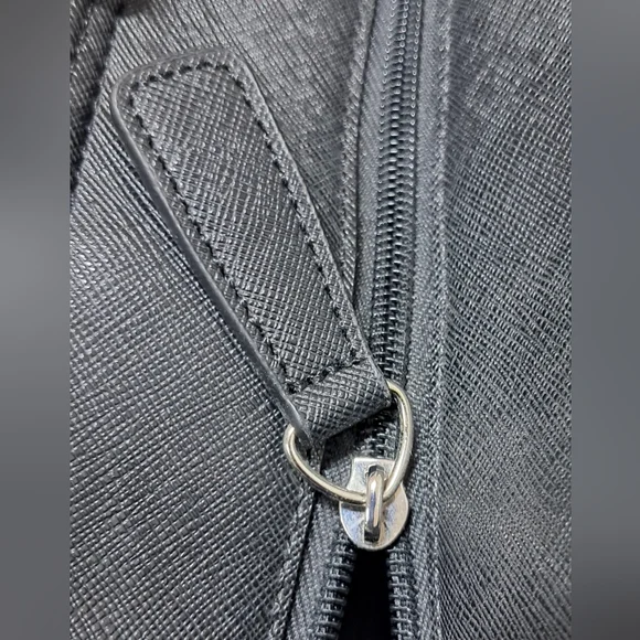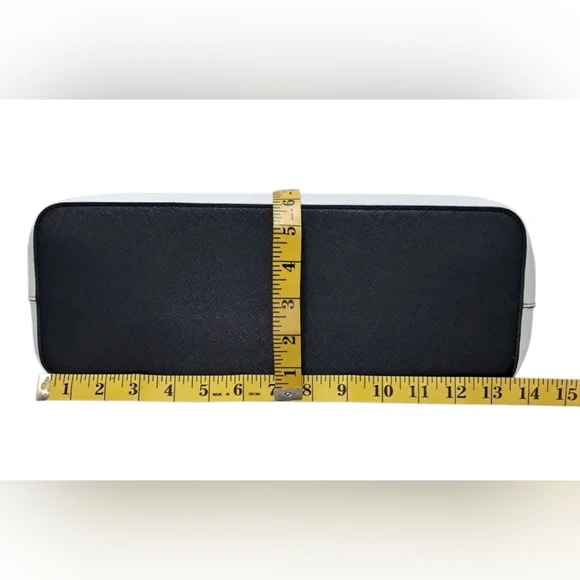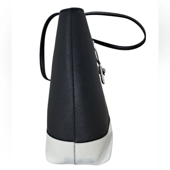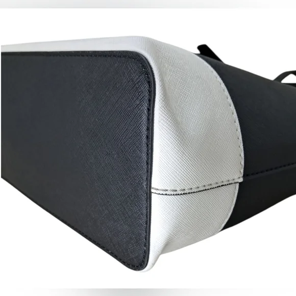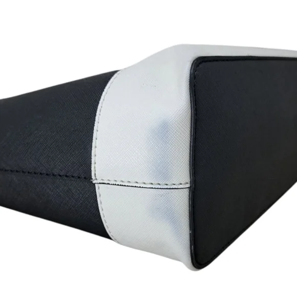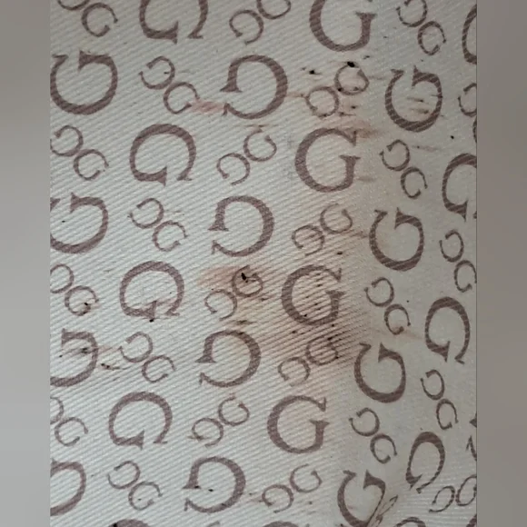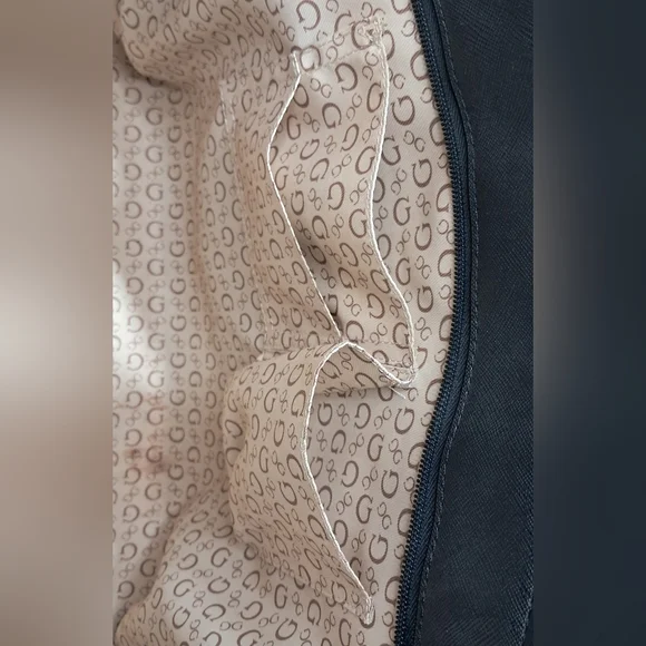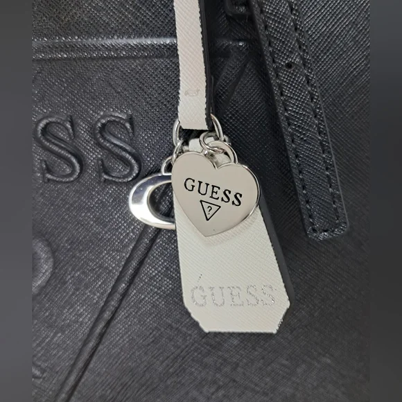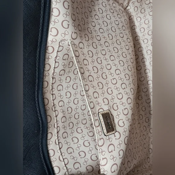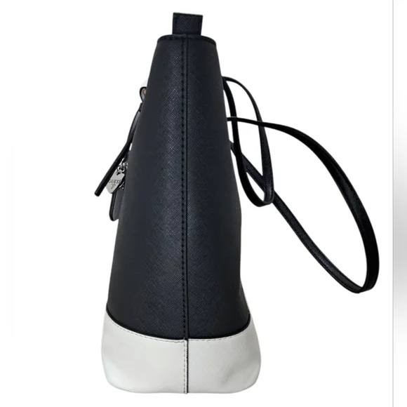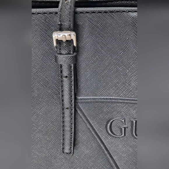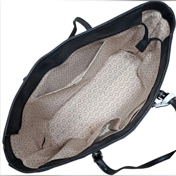 GuessEmbossed Tote/Carryall BagGreat Condition (has an area of subtle discoloration on bottom right corner and a small water mark on bottom of the interior lining as shown in photos, otherwise excellent condition).Large Capacity Black and White/ Silver-tone metal hardware.Faux saffiano leather.Embossed logo.Large Trapezoid silhouette.Clean, spacious interior.Single compartment construction.Logo print fabric lining with multiple slip pockets.Removable silver-tone metal, double logo keychain.Top zip closure.Dual "belt" handles with decorative buckle embellishments.Approximate Measurements in Photos.Elevate your style with this chic GUESS tote bag. Featuring a sleek black and white design, this bag is perfect for any occasion. Crafted with attention to detail, it offers both elegance and functionality. Perfect for on-the-go style!Reasonable offers are welcomed.