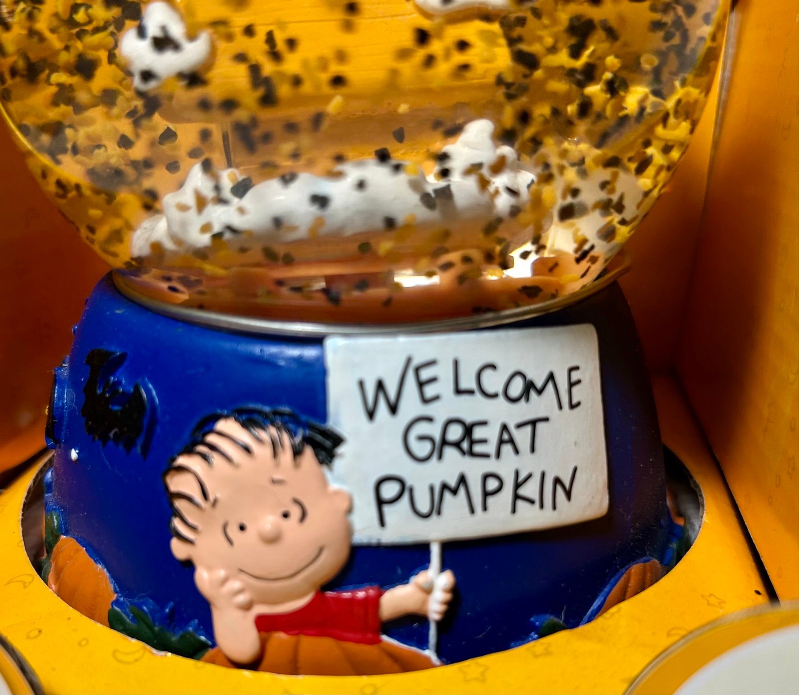 Snoopy & Woodstock take center stage in the SnoMotion Waterglobe. Orange and Black snoopy swirl around continuously as the Peanuts traditional theme music plays. Linus is at the base in a 3D raised picture of him holding up his sign “Welcome Great Pumpkin!”.