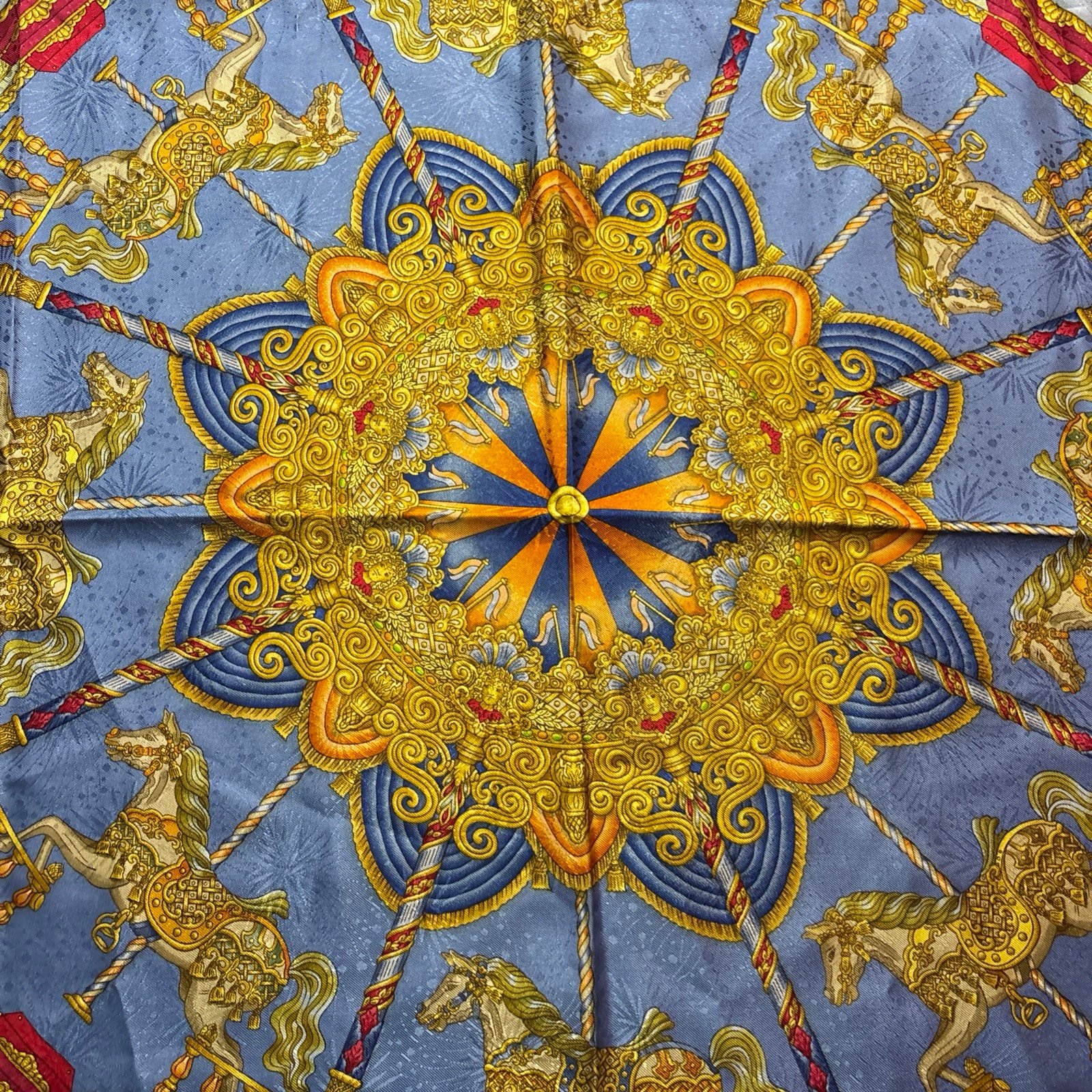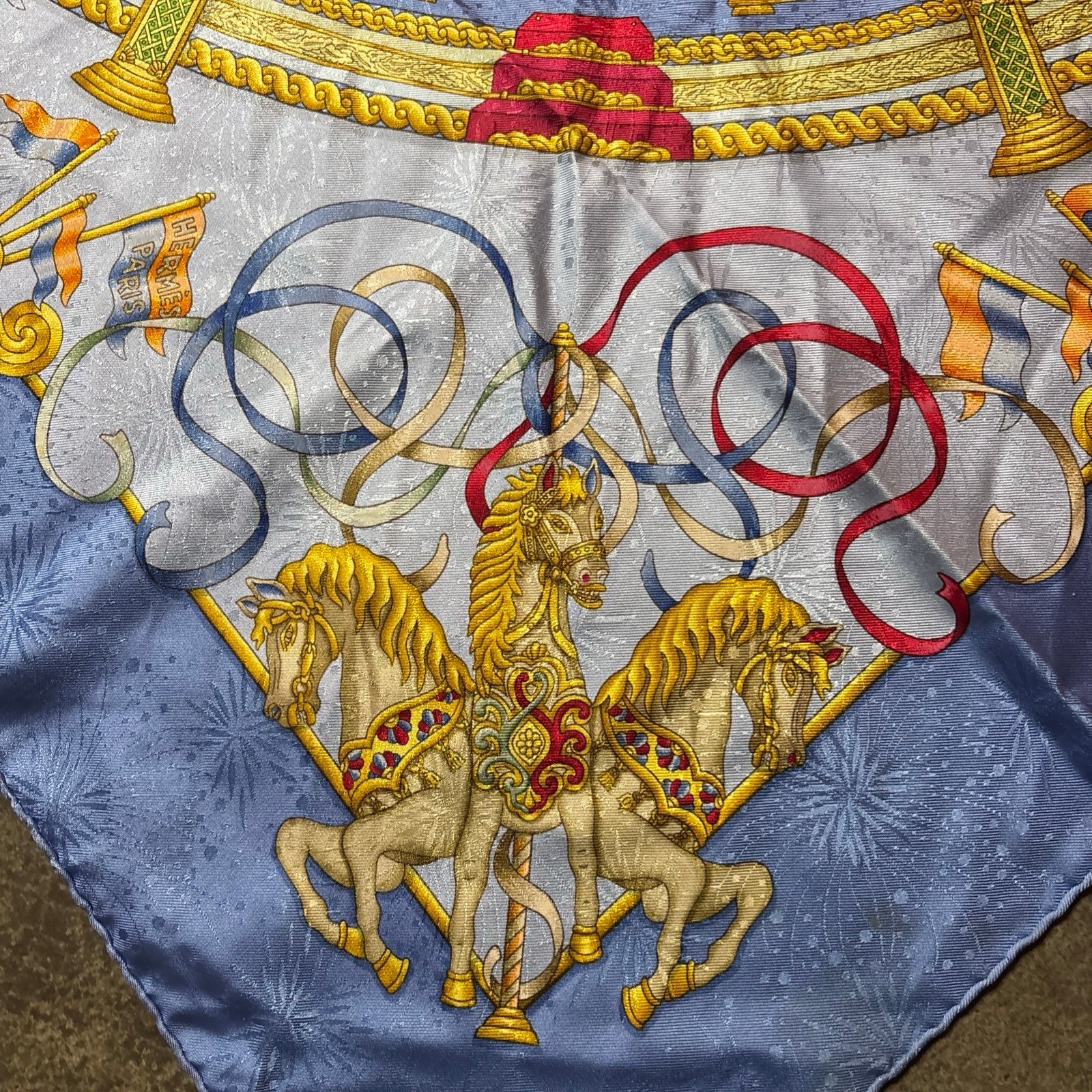 This beautiful scarf shows no signs of wear. No stains, snags or raveled edges. Bought at an estate sale from a family who lived in France for a time. The HERMÈS Carre 90 100% Silk Scarf in Light Blue features a festive Luna Park pattern, perfect for summer, fall, and spring. Made in France, this square scarf is a luxurious accessory for women, adding a touch of elegance to any outfit. With a dry clean only care instruction, this high-quality silk scarf is a stylish and timeless piece to elevate your wardrobe.