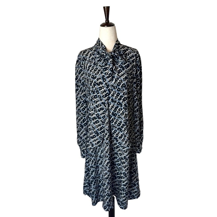 designer, luxury, 100% silk, silky, silk, domino, polka-dot, polka dot, preppy, geometric, geo, London, England, Preppy, casual, classic, trendy, stylish, chic, wedding, party, chic, travel, vacation, shift, shirt dress, Fit and Flare, fit & flare, Fit n flare, form flattering, mini, knee length, grandma core, grandmacore, cottagecore, coastal grandma, Designer, Luxury, stretch, comfortable, comfy, lightweight, date night, night out, elegant, sophisticated, glam glamorous, timeless, mature, mod, modern, Domino Print, Shirt dress, Mini, Short, Women's, Womens, Size 4, S, Small, Silk