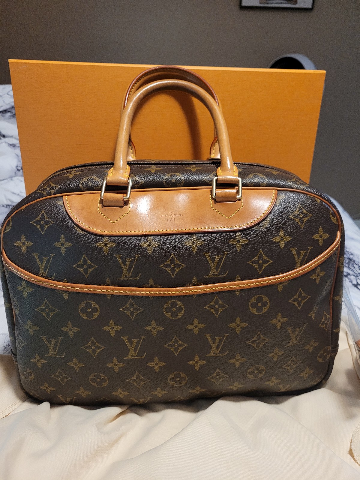 Beautiful condition vintage LV Deauville! Everything is in tact. Inside, all pockets are clean, with no stains, rips, or damage. This was barely used! No piping exposed. Corners are in tact. Handles are clean with minimal signs of use. There are slight water marks on the vachetta (pictured) and darkening on certain areas of the vachetta lining (pictured). Double zippers work great. Comes with LV tag and lock # 321. There is no key. Monogram is still vibrant and bright, with no cracking. This will come with dustbag and 2 COAs. This is a stunning vintage piece that is not produced anymore.