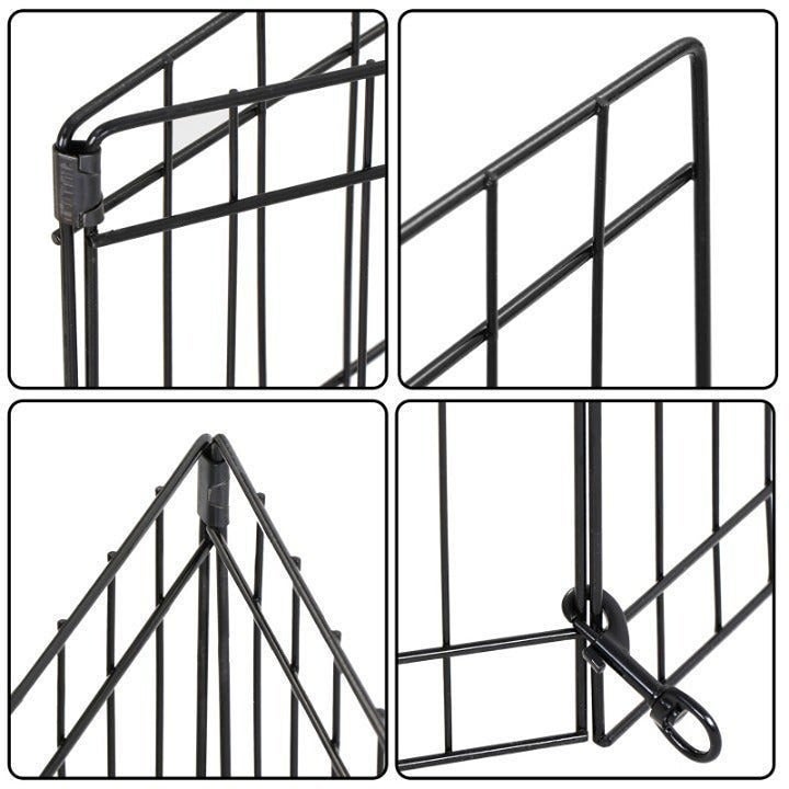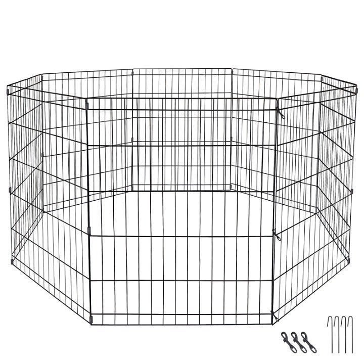 Made of durable iron metal, the sturdy pet pen holds its shape, offers long-lasting strength, and stands up to everyday use. Even more, its sleek black finish provides rustproof performance and protection against outdoor elements.