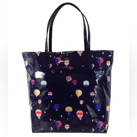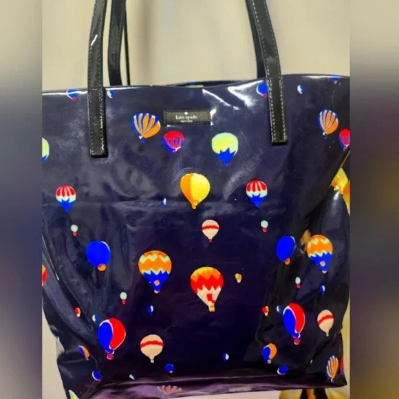 *EUC*FeaturesBon shopper shoulder bag in printed coated poplin.Contrasting smooth cowhide trim.printed kate spade new york signatureOpen top. Custom woven quick & curious lining w interior zip and double slide pockets13.5"h x 13.7"w x 5.1"d drop length: 9''Fabric type: PvcOuter material: Patent,PvcInner material: Polyvinyl ChlorideClosure type: No ClosureAbout this item: Shoulder bag with an open top and dual interior slide pockets: Printed coated poplin with patent pvc trim14-karat light gold plated hardwareMeasures 13.5"h x 12.3"w x 5.1"dCapital Kate jacquard liningDescriptionKate Spade Daycation Bon Shopper Tote Bag featuring whimsical hot air balloon pattern. Bag is navy blue.