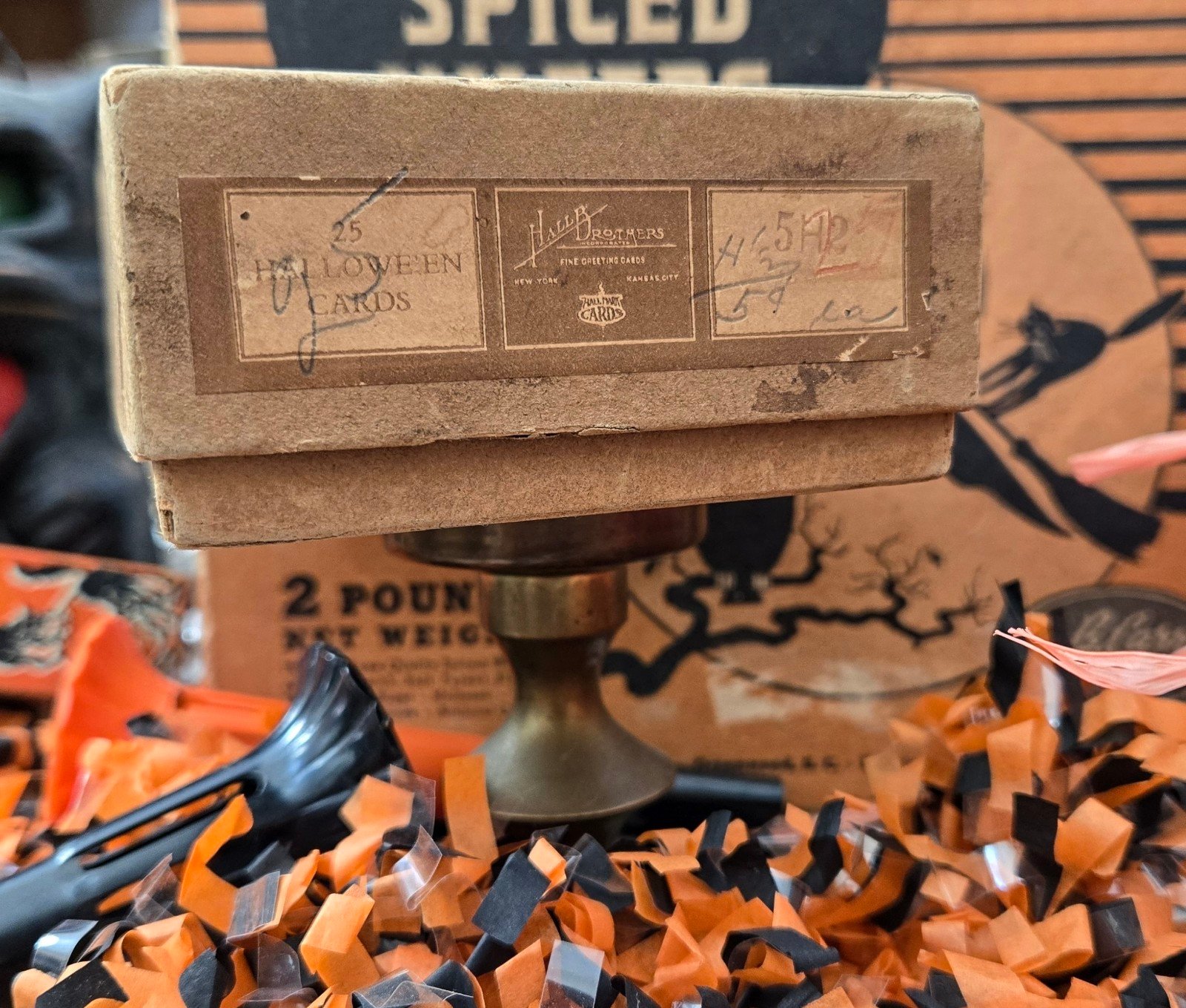 Before there was Hallmark, there was Hall Brothers Incorporated. This antique (1920's) Halloween greeting card, w/ original envelope, is in mint condition. Rarely seen, and quite difficult to come by, this Halloween greeting card comes in a vibrant and contrasting green, yellow, black, and orange- almost appears to be 3 dimensional in its layered printing. Featuring a jack o lantern, candle sticks, cobwebs, and an owl; the whole gangs here! Reading: "On Hallowe'en- When the pun'kin head wears an awful scowl, An' th' goblins and the witches howl, I hope that every hoot-owl's "whoo", Says Happy Hallowe'en to you". Cards measure 4 x 3 1/8 inches. Stored away in its original box (not included), you can see the Hall Brothers company marking, the precursor to today's Hallmark Cards. Listing is for 1 card w/ accompanying envelope. Perfect addition to any collection. See my other listings for paper mache pulp choirboy jack o lanterns, vintage die cuts, noisemakers, postcards, Rosbro, and more