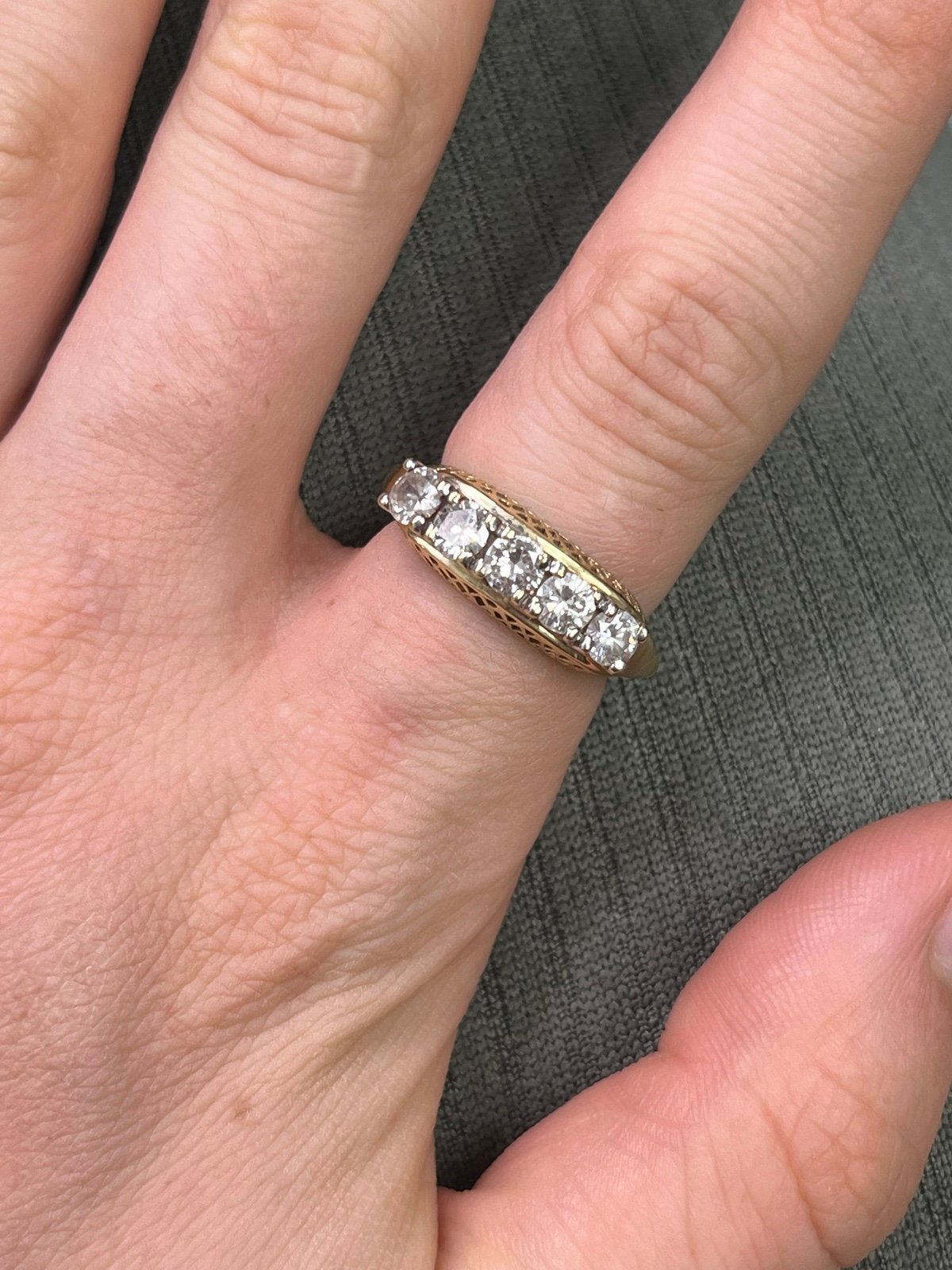A beautiful, pretty 14k yellow gold 5 center real natural white-round diamonds filigree Victorian style ring