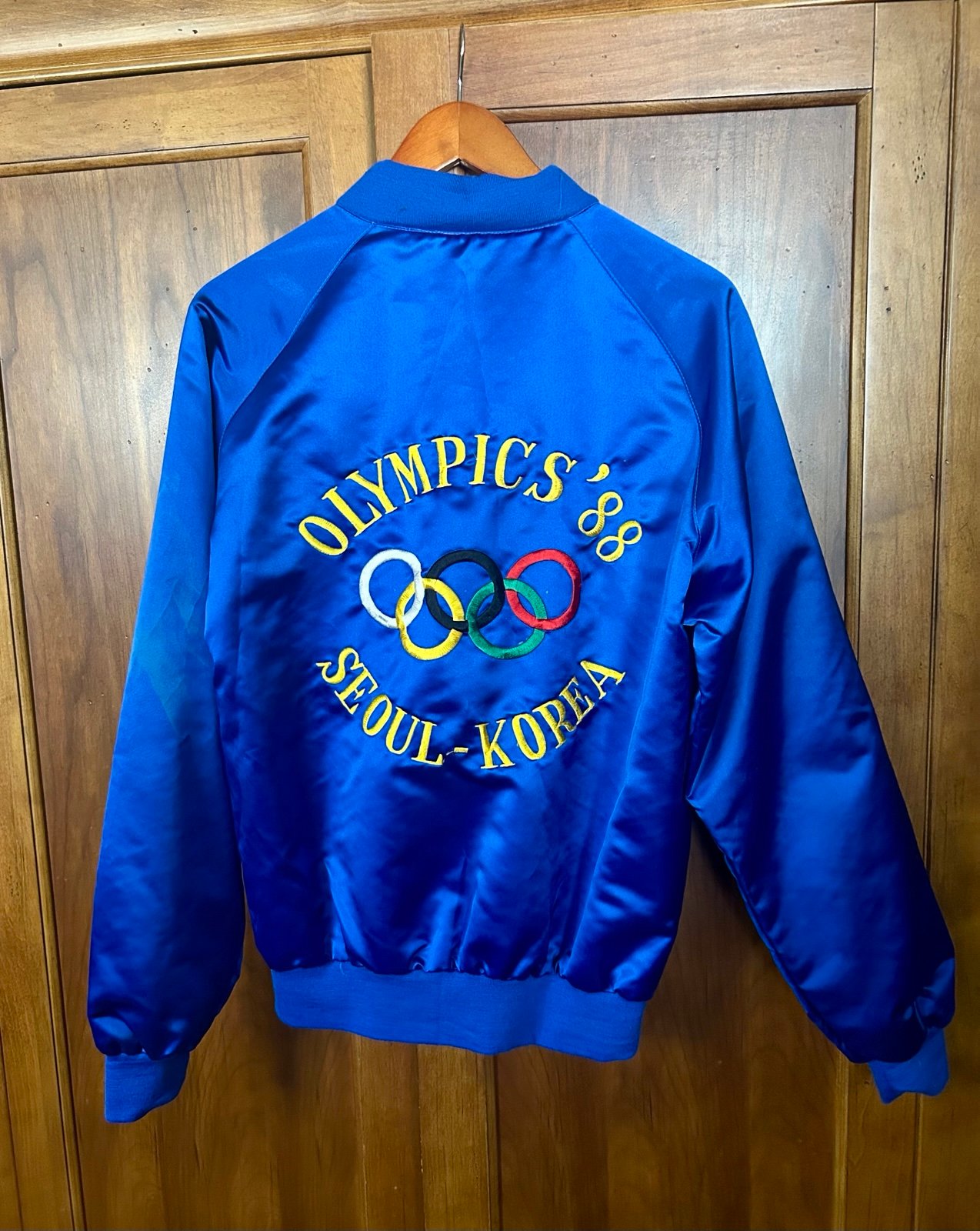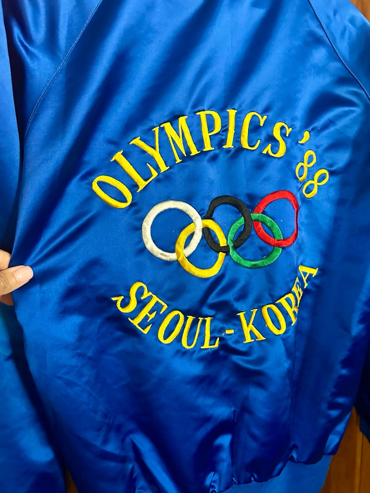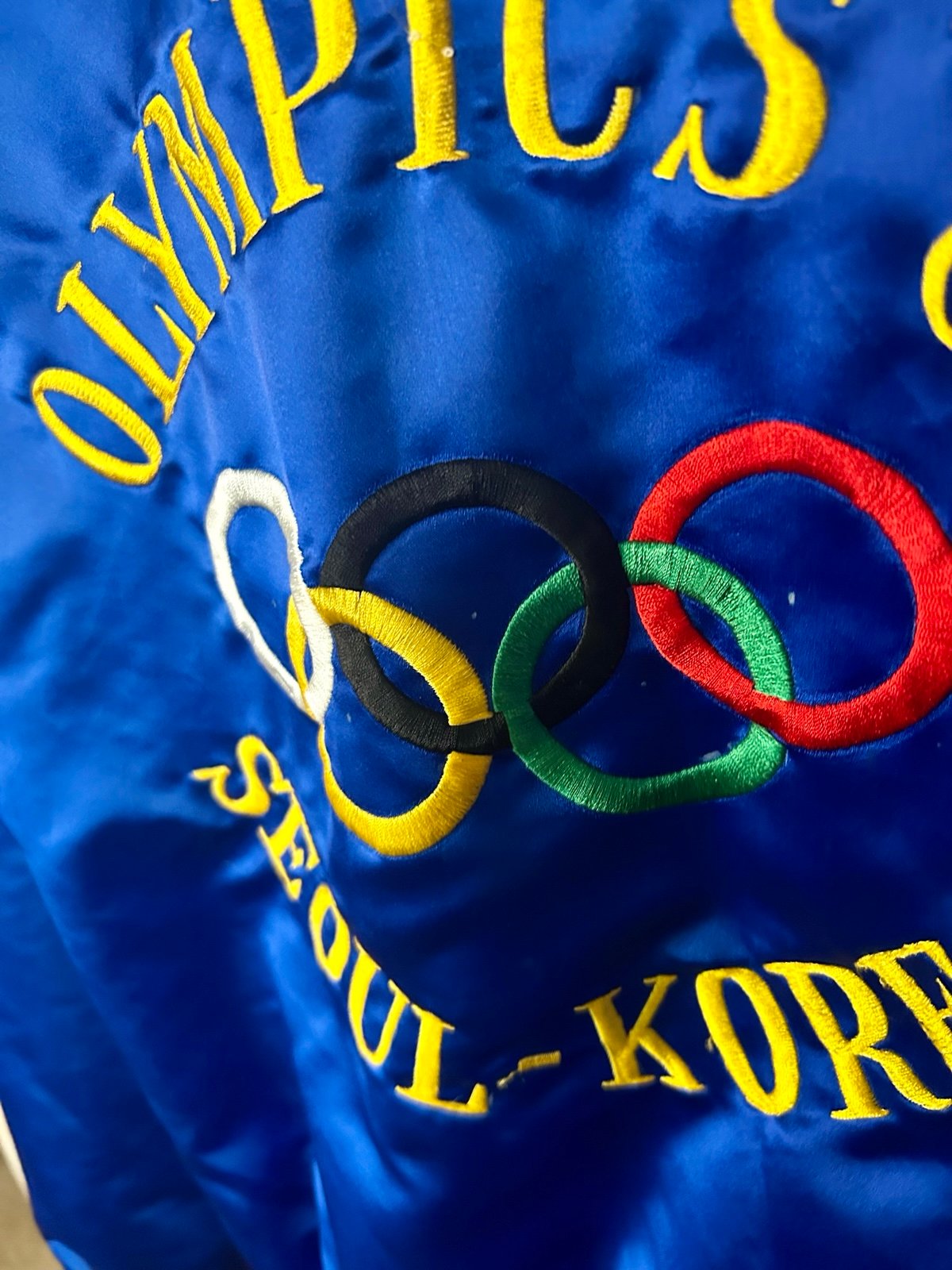 This vintage 1988 Seoul Olympics South Korea NBC souvenir jacket in navy blue satin is a unique collectible item celebrating the historic event. Featuring the colors of blue and representing the team of South Korea, this jacket is a must-have for fans of both the Olympics and South Korean culture. The satin material adds a touch of elegance, making it a stylish and practical piece for any sports enthusiast or collector looking to commemorate the 1988 Olympics