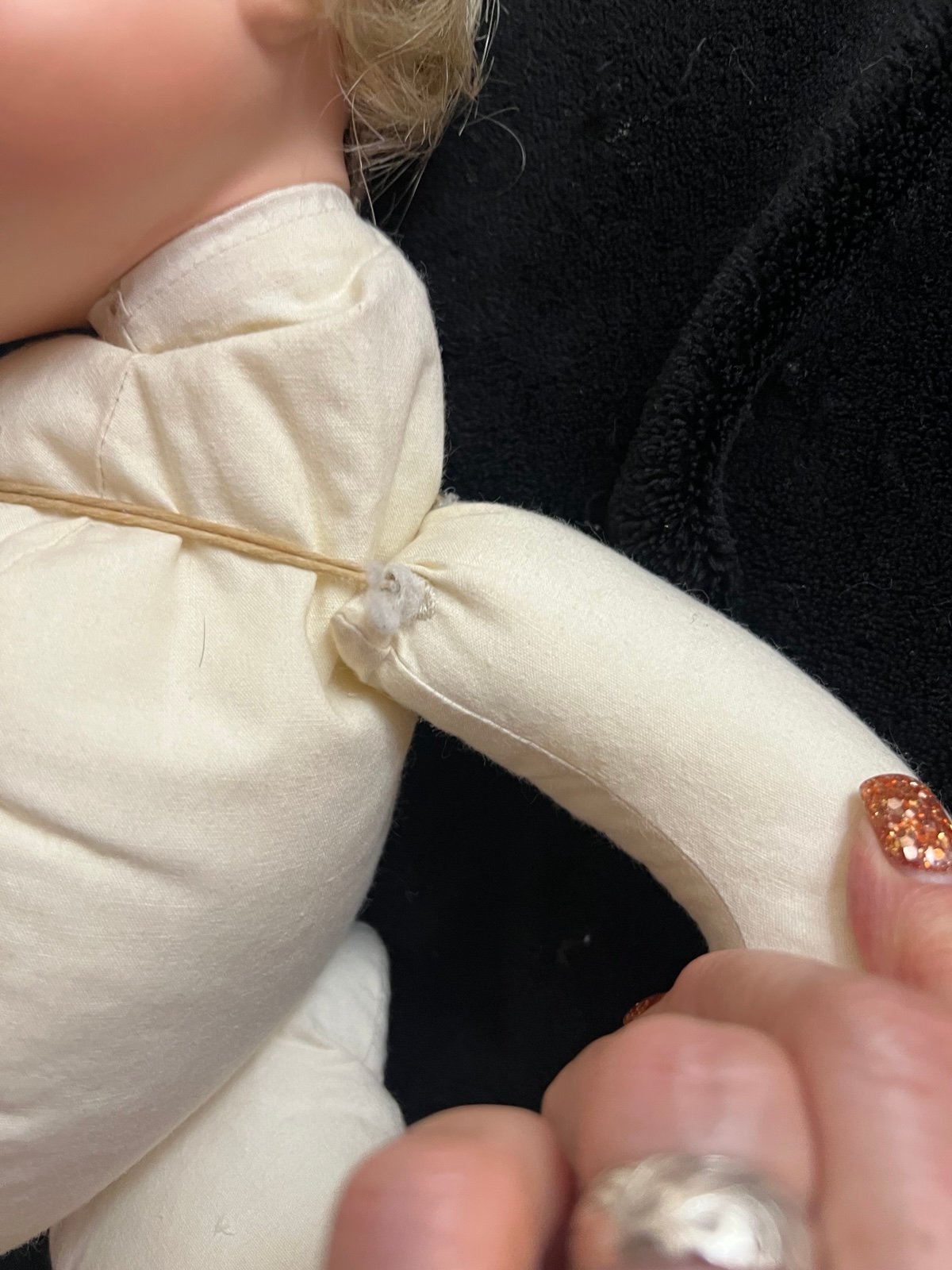 He is a unique reborn baby. He has a soft vinyl head and hands but cloth body is filled with beads. His arms are separate and attached by twine. His leg has had some stitches as well.