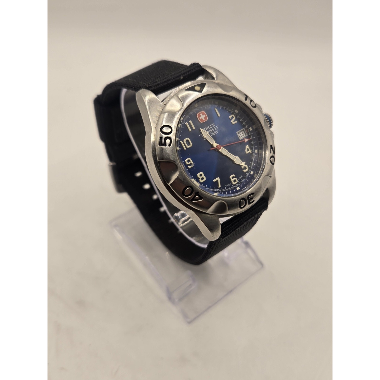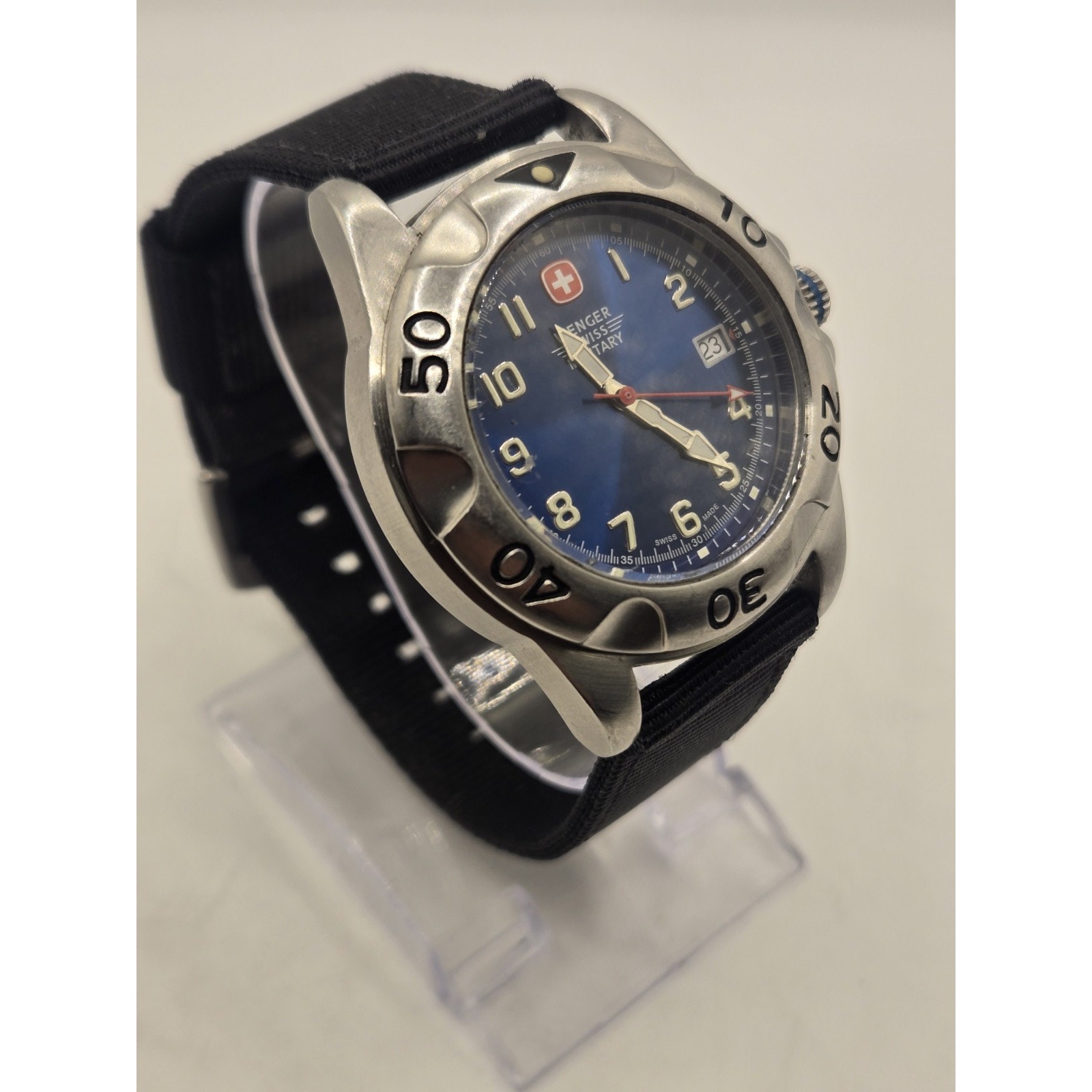 The Vintage Wenger Swiss Military Men's Dive Watch is a classic timepiece with a round silver case and unidirectional rotating bezel. Featuring Arabic numeral indices and a date indicator, this watch is perfect for those who appreciate both style and functionality. With a water resistance of 100 meters, this quartz movement watch is ideal for everyday wear or outdoor activities. The two-piece black leather strap adds a touch of sophistication to this Swiss-made timepiece from the renowned Wenger brand.