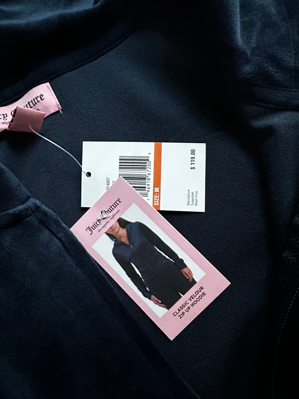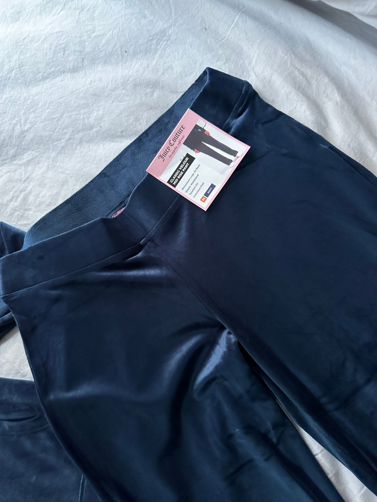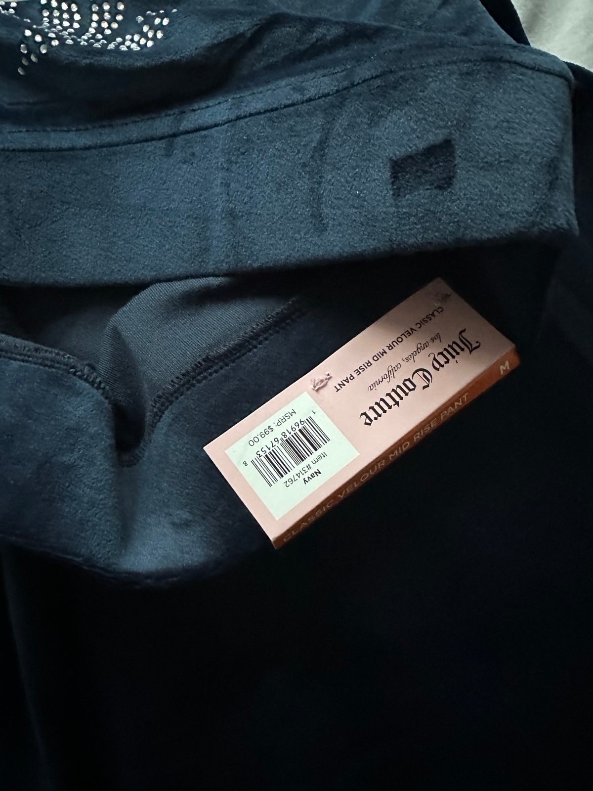 VIRAL New with tags, Juicy Couture classic velour tracksuit, in color ‘Navy’. The sweatshirt is a size MEDIUM and retails for $119. The pants are mid-rise, flare size MEDIUM and retails for $99. Rhinestones on back. This is a gorgeous set!!! Perfect gift for Christmas!!